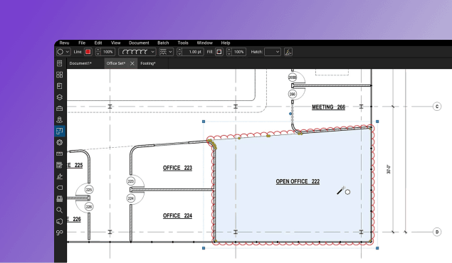 Una de las funciones más aclamadas de Revu, Relleno dinámico, automatiza medidas complejas al rellenar formas irregulares para generar rápidamente el perímetro, el área, el volumen y más.