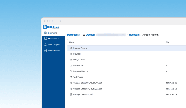 Marca los archivos almacenados en Procore Documents directamente desde Bluebeam en la web, los cambios se sincronizarán automáticamente. Los archivos ahora también se pueden importar directamente al crear una Sesión de Studio. Se acabaron los bucles de descargas y cargas.