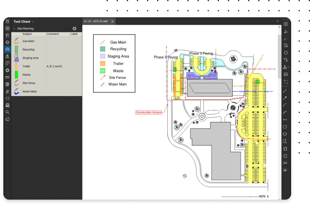 Bluebeam programvara för APD-planering erbjuder anpassningsbara verktyg som gör det enklare att hantera APD-planer. APD-planerna kan nÄs frÄn vilken dator eller mobil enhet som helst, vilket gör det möjligt för byggteam att skapa, organisera och dela detaljerade APD-planer, Àven för de mest komplexa byggarbetsplatserna.